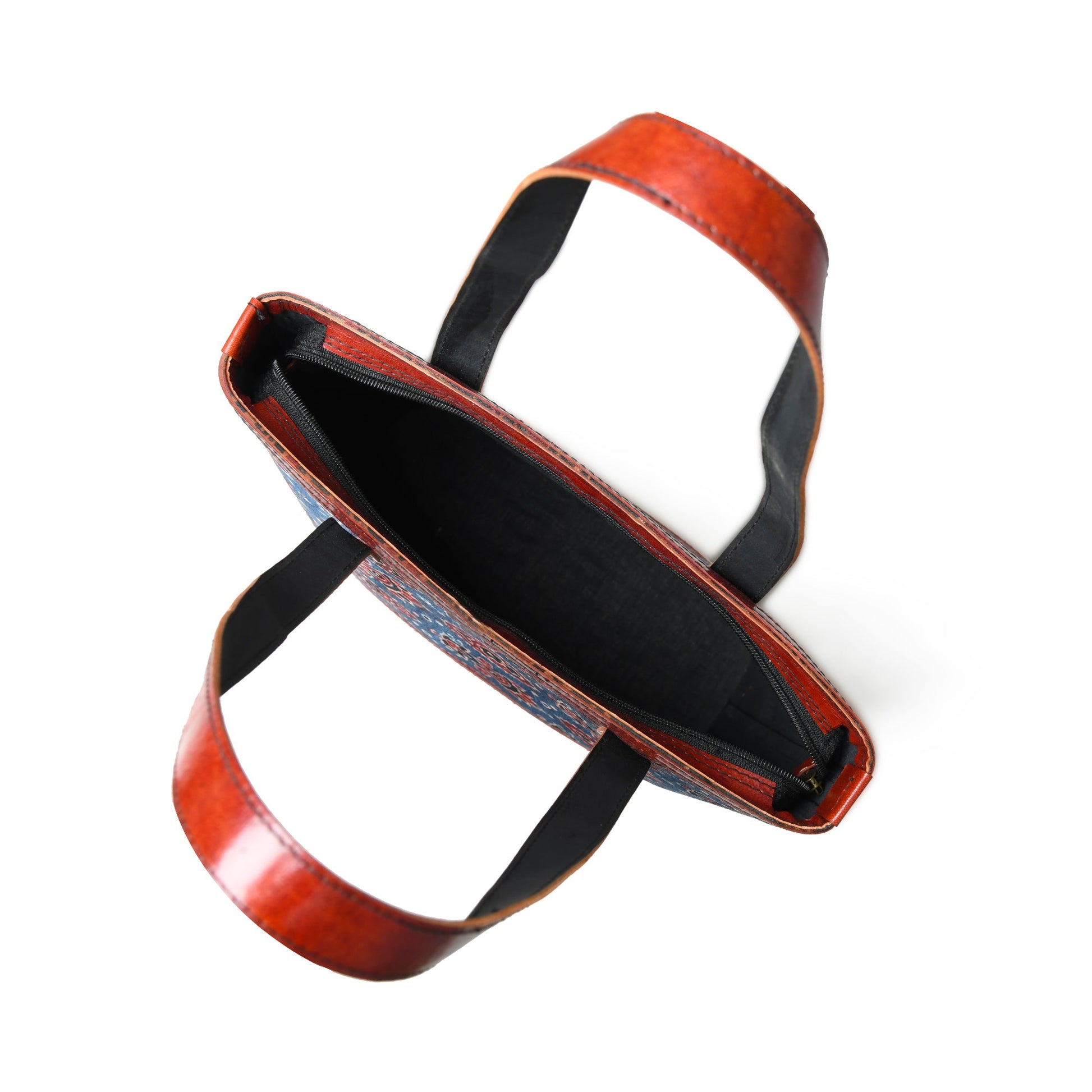 Introducing the handcrafted leather structured tote, where traditional craft meets modern design. The upper portion features authentic Ajrakh printed fabric stitched on durable leather, infusing a traditional and ethnic feel. With sturdy leather handles and a spacious central compartment, it accommodates books, journals, diaries, and laptops with ease. Crafted from naturally tanned buffalo leather, this tote embraces a chemical-free approach, allowing you to carry a piece of cultural heritage with style and environmental consciousness.