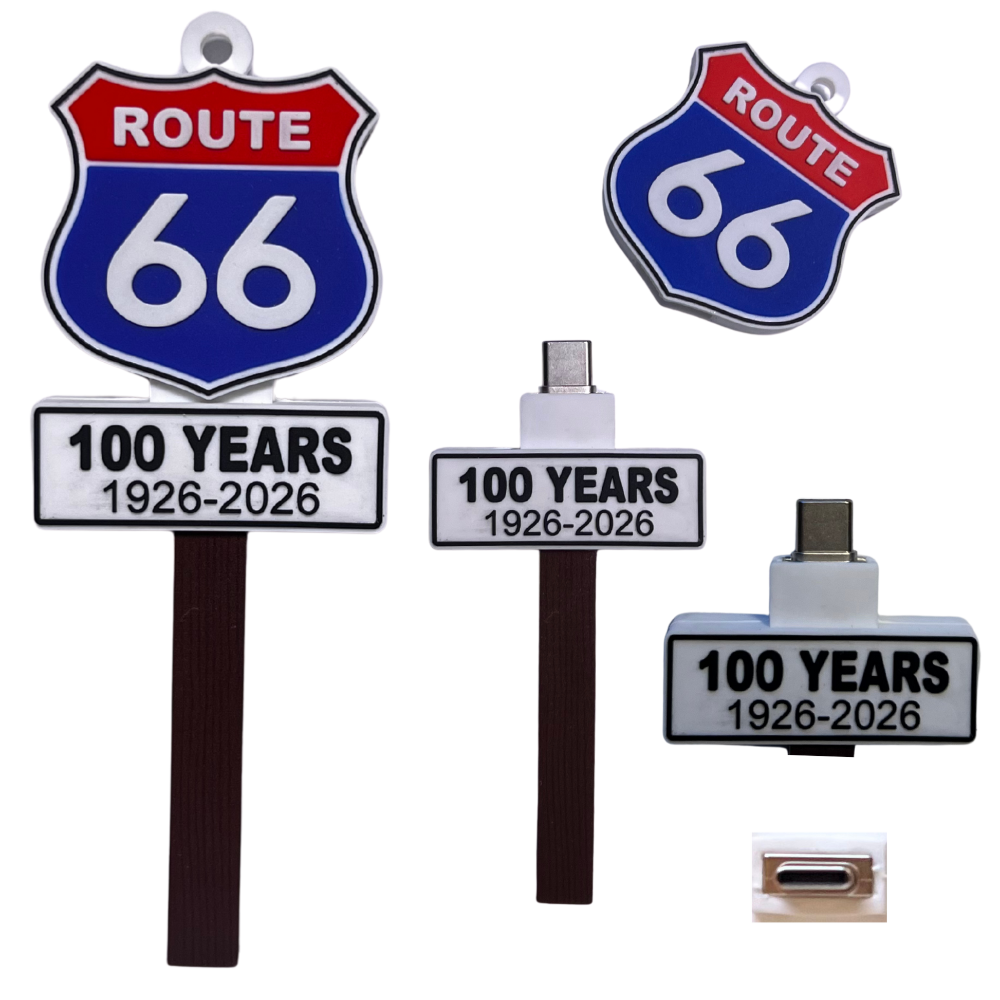 Each ornament features a hidden USB-C 3.0 flash drive, pre-loaded with curated Route 66 history, vintage photos, and stories—plus space for you to add your own travel memories.